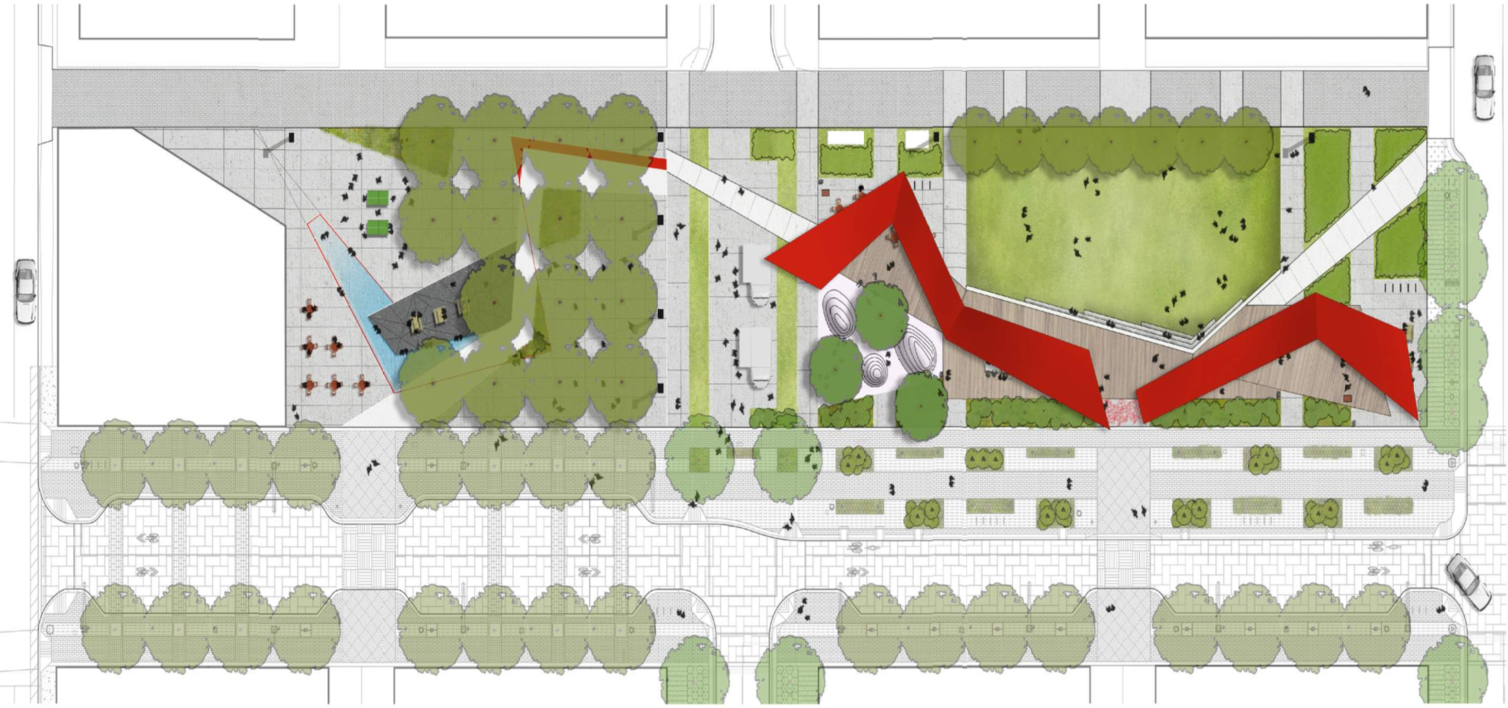 The armature was designed by DIALOG, intending to act as a thread that weaves in and out of the landscape. The artwork “family pattern” is fastened to the underside of the red canopy and extends down to touch the ground in two places. The pattern attempts to amplify the concept of cultural erasure by weaving in and out of the armature. The pattern also speaks to the resiliency of Indigenous people regardless of time and place. The floral pattern should feel familiar to those who recognize northern Cree/Métis beading patterns and is intended to make those who see it more comfortable visiting the park.